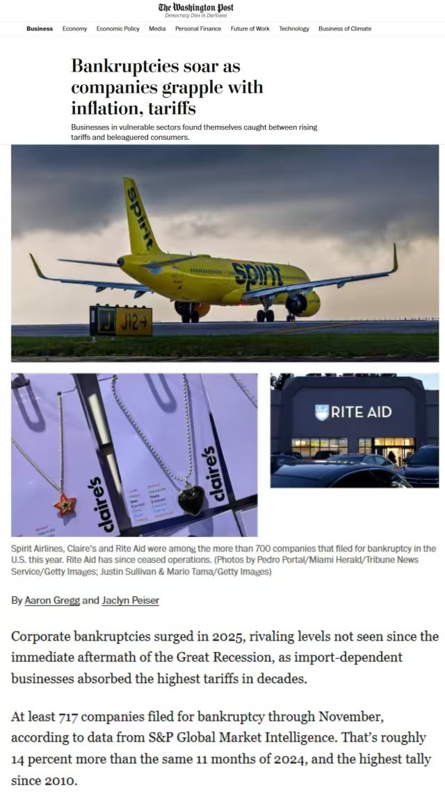 美国《华盛顿邮报》网站近日刊文称,由于依赖进口的企业承受了数十年来最高的关税压力,今年美国企业破产数量激增。文章援引标普全球市场情报数据显示,截至11月底至少有717家公司申请破产,达到2010年以来的最高水平。